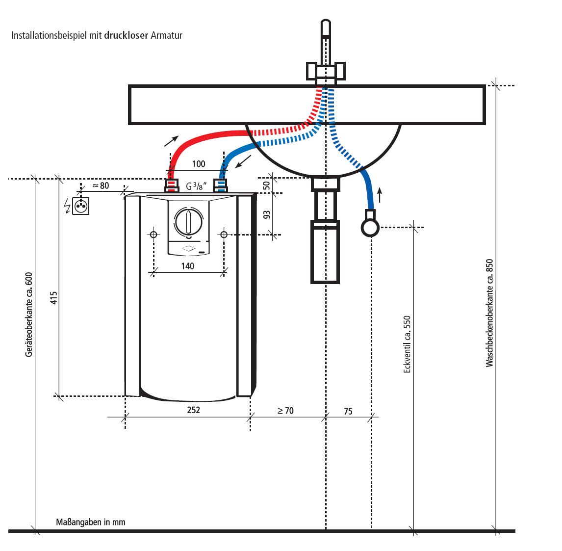- Die Installation ist nur in Verbindung mit einer speziellen Armatur für offene Warmwasserspeicher zulässig.